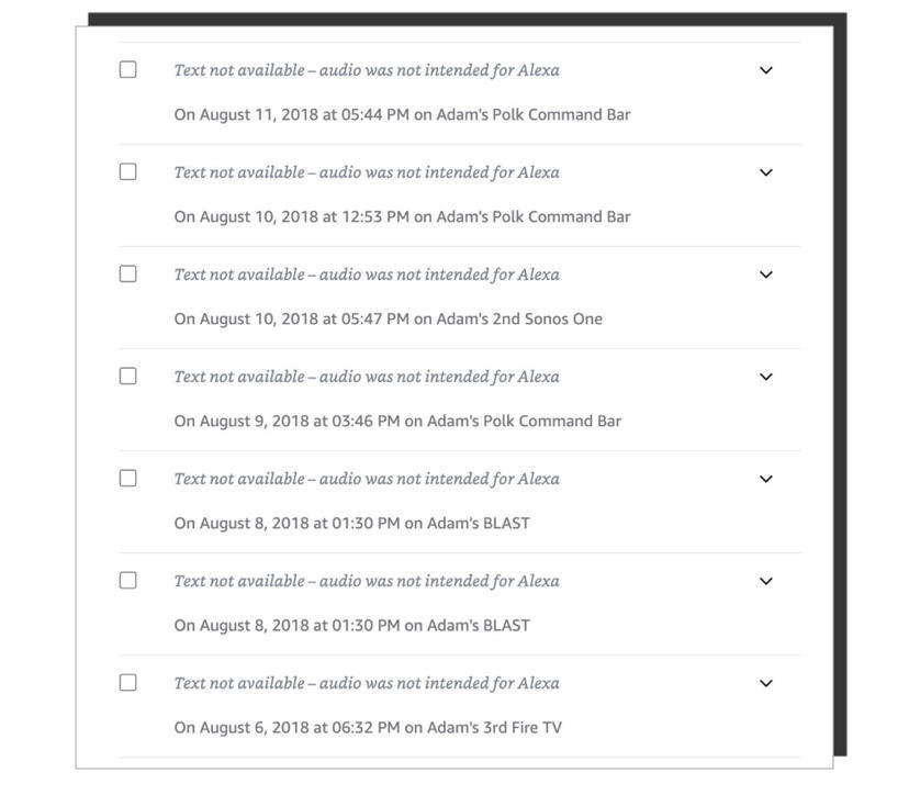 当我开始阅读亚马逊网站上Alexa命令的历史记录时,误报问题的严重程度变得非常明显。虽然大多数条目都很无聊,比如:“嘿,Alexa”、“给我看看煎蛋卷食谱”、“最近怎么样?”但在这些平淡无奇的信息中,也散布着一系列令人生畏的信息:“文本不可用(备注:音频不是为Alexa准备的)”每次看到它,我都会再看两遍,然后在脑海里大声念出来:“音频不是为Alexa准备的。”“这些是Alexa听到的但不却是不应该听到的东西,这些命令已经被发送到亚马逊的服务器,然后又被发送回来,因为这台机器认为没有说唤醒词,或者Alexa在用户没有发出命令时录制了音频。换句话说,这些语音信息是被错误的接收了。