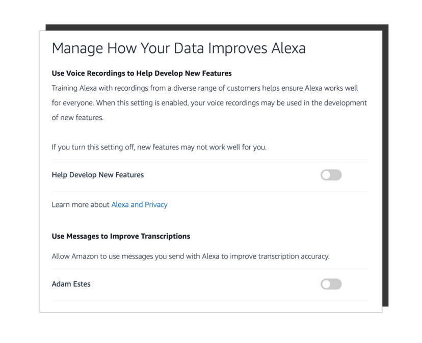 所以我发现自己又回到了几个问题上。谁来照顾用户的感受?为什么我不能选择让Amazon记录我的命令,而不是费力地通过隐私设置寻找停止向Amazon发送数据的方法呢?为什么我的选择有限?